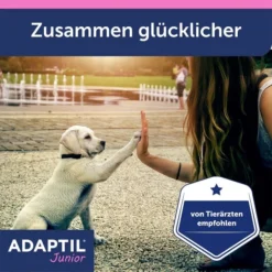 Adaptil Junior ist ein Halsband, das beruhigende Pheromone an Ihren Welpen abgibt. Mutterhündinnen produzieren dieses Pheromon auch, damit sich ihre Welpen wohlfühlen. Das hilft Ihrem Welpen, sich an die neue Familie und sein neues Zuhause zu gewöhnen und neue Eindrücke entspannter aufzunehmen. Um Ihrem Welpen beizubringen, mit unbekannten Situationen umzugehen, ist es ratsam, das Tragen des Halsbandes über die gesamte Sozialisierungsphase (6 Monate) fortzusetzen. Es ist wichtig, bei einer Besserung das Halsband für einen weiteren Monat zu tragen.