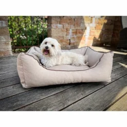 Das bequeme Hundesofa von Aumüller hat einen formstabilen, schweren Kissenrand und eine hochwertige Füllung aus verklebungsresistenten, antibakteriellen Visko-Sticks. Dadurch ist es besonders formstabil und wird mit dem robusten Canvasstoff abgerundet. In Kombination mit den stabilen Nähten ist der Stoff biss- und kratzfest. Der Einstieg ist sehr niedrig, sodass auch kleinere oder ältere Hunde bequem darauf platz nehmen können.