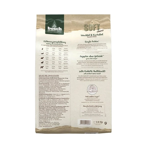 Bosch SOFT mini Wachtel & Kartoffel ist ein Single Protein-Produkt für die ausgewogene und gesunde Ernährung ausgewachsener, kleiner Hunde. Unser SOFT mini Wachtel & Kartoffel ist besonders für ernährungssensible Hunde geeignet, die unter Futterunverträglichkeiten und Allergien leiden.