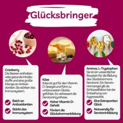Cranberry und Käse lassen die Glückshormone ausschütten – das sogenannte Serotinin. Ein Serotoninmangel gilt somit als Schlüsselfaktor bei der Entstehung von Aggressivität, Impulsivität und Hyperaktivität. Cranberry und Käse sind serotoninfördernde Zutaten. Unsere weinrote Variation enthält Cranberry und Käse. Zur absoluten Glückseligkeit setzen wir unseren weinroten Sorten L-Tryptophan zu. L-Tryptophan ist ein wesentlicher Baustein für die Bildung des Glückshormons Serotonin.