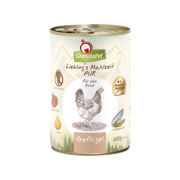 Dieses vitaminreiche Nassfutter bietet deinem Hund eine ausgewogene Mahlzeit. GranataPet Lieblingsmahlzeit Geflügel Pur verwöhnt auch den zartesten Gaumen. Das Futter ist für Hunde aller Größen zu empfehlen sowie speziell auf die Bedürfnisse von jungen Hunden, ausgewachsenen Hunden und Senioren angepasst. Mit 68% hat das Futter einen sehr hohen Anteil an Fleisch und Innereien. Die beigefügten Vitamine können zu einem wirksamen Immunsystem beitragen und die Abwehrkräfte stärken. Omega-3-Fettsäuren können bestens über das Lachsöl eingenommen werden. Durch Lachsöl kann das Tier von schönem Fell und gesunder Haut profitieren.