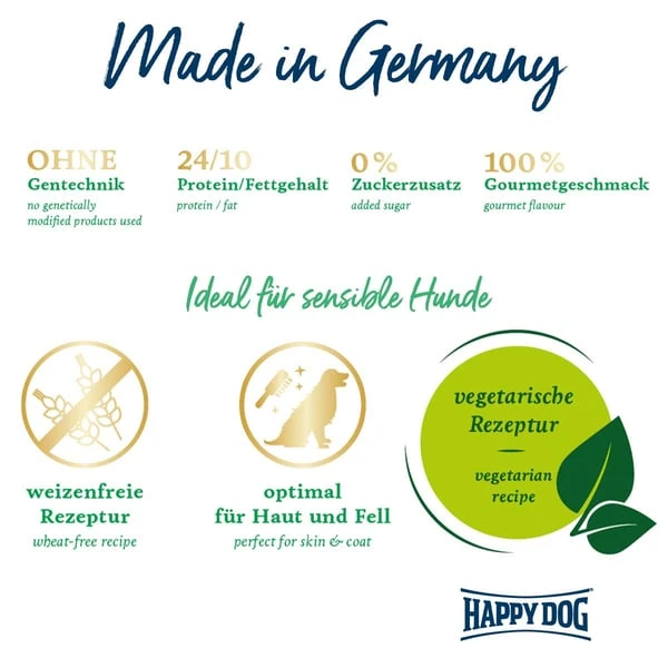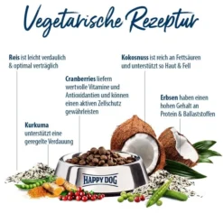 Sorge mit der vegetarischen Komposition aus gut verträglichem Reis und Erbsen für Abwechslung im Napf deines vierbeinigen Feinschmeckers. Ein echter Leckerbissen, der unter anderem dank vieler Omega-3- und 6-Fettsäuren ein glänzendes Fell und eine intakte Haut unterstützt. Kombiniert mit den wertvollen Eigenschaften von Cranberries, Kokos und Kurkuma ist es die ideale Ernährung für anspruchsvolle und sensible Genießer mittlerer und großer Rassen. Mit unseren Happy Dog Supreme Sensible Produkten fütterst du beste Premium-Qualität “Made in Germany“ – hergestellt in unserem Familienbetrieb unter strengsten Qualitätskontrollen.
