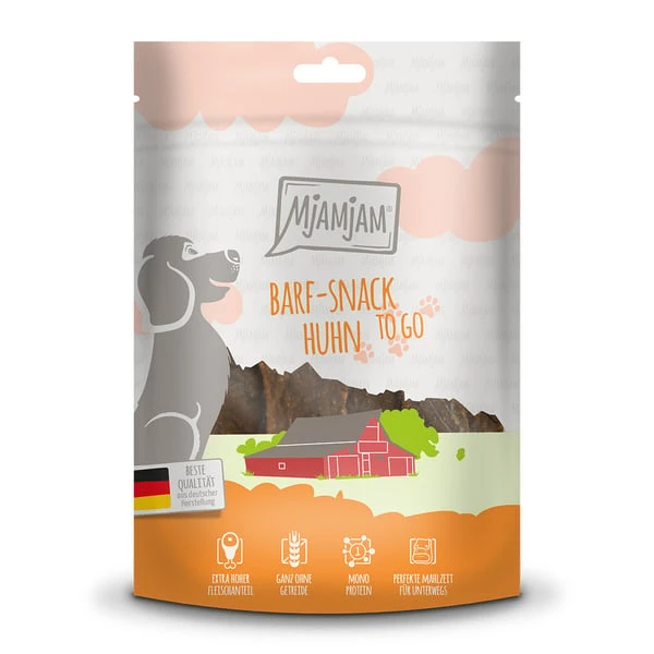 Der MjAMjAM BARF-Snack to go – ist der optimale Snack für’s Handgepäck. Ob als Belohnung oder Reisemahlzeit, der BARF-Snack to go bietet deinem Hund den absoluten Gaumenschmaus.