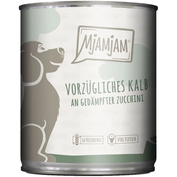MjAMjAM – leckere Mahlzeit mit schmackhaftem Kalbsfleisch, serviert an gedämpfter Zucchini. Diese Mahlzeit bietet deinem Liebling alles was er braucht. Das frische Fleisch, verfeinert mit knackigen und gesunden Zutaten, gibt ihm ein einzigartiges und exklusives Genusserlebnis, das ihn zugleich mit allen wichtigen Vitaminen und Mineralien versorgt. MjAMjAM – leckere Mahlzeiten für deinen Liebling: Artgerecht, Natur- und Beutenah.