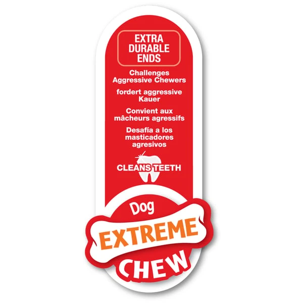 Der Nylabone Extreme Beinknochen ist besonders artgerecht und auch für große Hunde geeignet. Das Kauspielzeug ist genau das Richtige für Ihren Hund, wenn er gerne kaut und sehr gut darin ist! Diese Kauspielzeuge haben einen durchweg anhaltend köstlichen Geschmack, der Geschmack bleibt während des gesamten Kauvorgangs erhalten, da sie weder besprüht, eingetaucht noch auf irgendeine Weise mit Geschmacksstoffen überzogen werden. Somit ist es nicht möglich, den leckeren Geschmack wegzulecken! Die Materialien sind genauso hart wie echte Knochen, beinhalten aber nicht die gleichen Gefahren. Stattdessen wird die schöne, glatte Oberfläche mit dem Kauen rauer und winzige Borsten beginnen, vom Knochen abzustehen und funktionieren wie eine kleine Zahnbürste. Sie helfen, die Zähne Ihres Hundes sauber zu halten und die Bildung von Zahnstein zu verhindern. Sollte es Ihrem Hund doch einmal gelingen, etwas abzubeißen, lösen sich nur reisgroße Körnchen, die bei der Abnutzung die Zähne putzen und problemlos durch die Verdauung gehen. Es ist wichtig, dass Sie die richtige Größe und Art des Kauknochens gemäß Alter, Gewicht und Kaustärke Ihres Hundes auswählen, sie sollten immer groß genug sein, dass seitliche Kauen anzuregen und nicht das Kauen von oben nach unten. Wenn sich mehrere Hunde im Haushalt befinden, sollten Sie einen Kauknochen auswählen, der sich für den größten, stärksten Kauer unter ihnen eignet. Wie immer sollte man auch unsere Spielzeuge nur unter Aufsicht geben. Diese Artikel sind nicht zum Verzehr bestimmt.