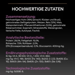 Hochwertiges Huhn (16%) (einschl. Rücken und Brust), getrocknetes Geflügelprotein, Weizen, Reis (12%), Mais, Maisproteinmehl, Pflanzenölfraktionen (5,5%), getrocknete Rübenschnitzel, Sojamehl, Mineralstoffe, Weizengluten, tierische Fette, Autolysat, Fischöl.