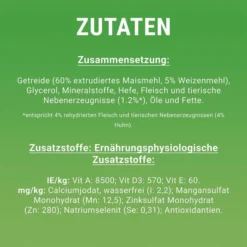 Getreide (60% extrudiertes Maismehl, 5% Weizenmehl), Glycerol, Mineralstoffe, Hefe, Fleisch und tierische Nebenerzeugnisse (1,2%*), Öle und Fette.