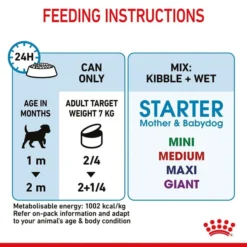 ROYAL CANIN Starter Mousse Mother & Babydog ist auch als Trockennahrung in Form von knusprigen Kroketten erhältlich. Wenn Sie eine gemischte Fütterung von Trocken- und Nassnahrung in Betracht ziehen, befolgen Sie einfach unsere Fütterungsempfehlungen. So stellen Sie sicher, dass Ihr Hund die richtige Menge an Nass- und Trockennahrung erhält.
