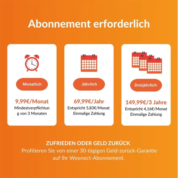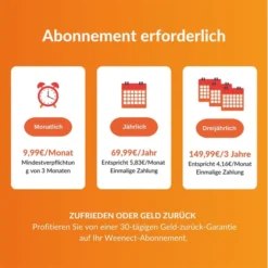 – Monatliches Abonnement: 9,99€ pro Monat. Die Zahlung erfolgt monatlich und die Kündigung ist jederzeit möglich. Die Mindestlaufzeit beträgt 3 Monate.