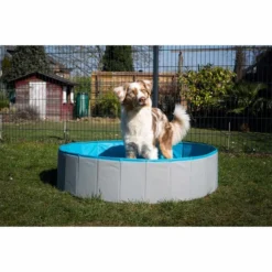 Es wird Zeit ihm die Sommerhitze erträglicher zu machen – mit dem ZooRoyal Hundepool aus kratzfestem PVC im modischen petrol/grau.